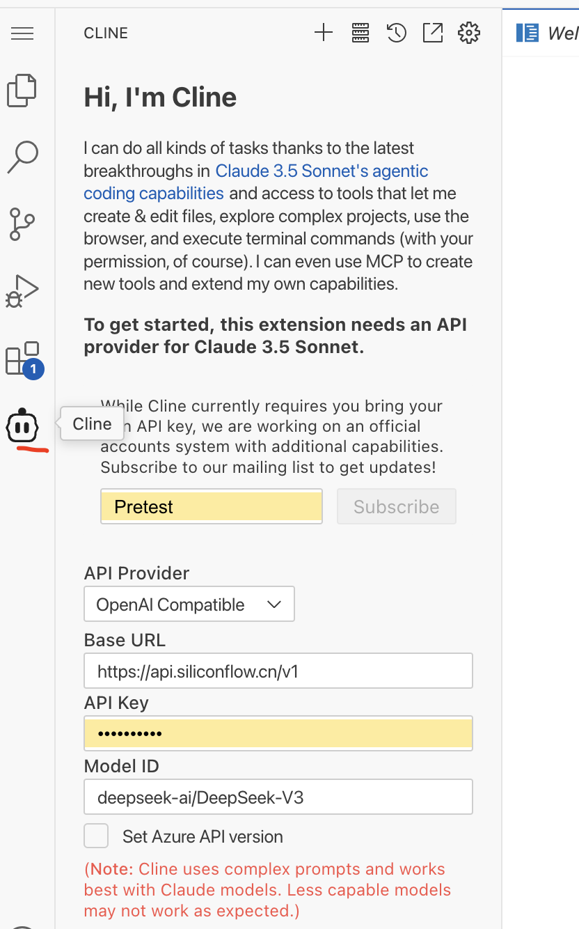 Click the CLINE icon in the left sidebar and configure your LLM model credentials: