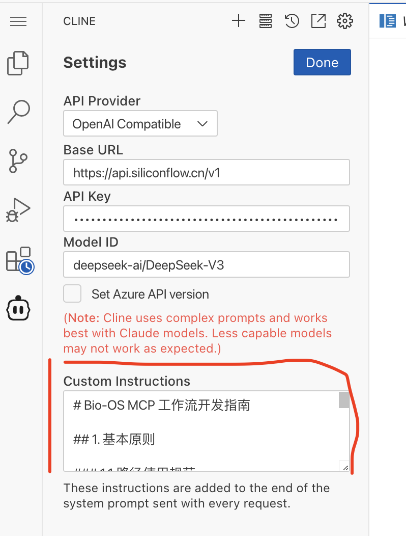 bioos-mcp-prompt.mdinto CLINE’s Custom Instructions for optimal experience: