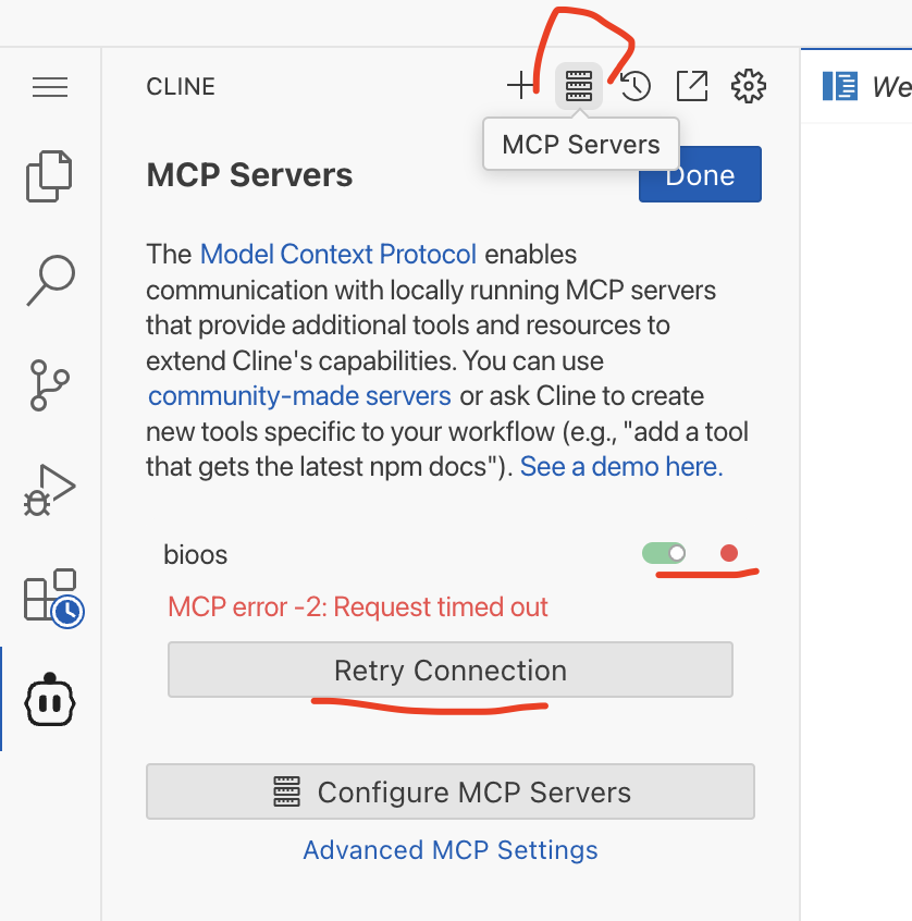 Navigate to CLINE’s MCP configuration page and verify that Bio-OS MCP Server is properly connected. Use “Retry Connection” if needed: