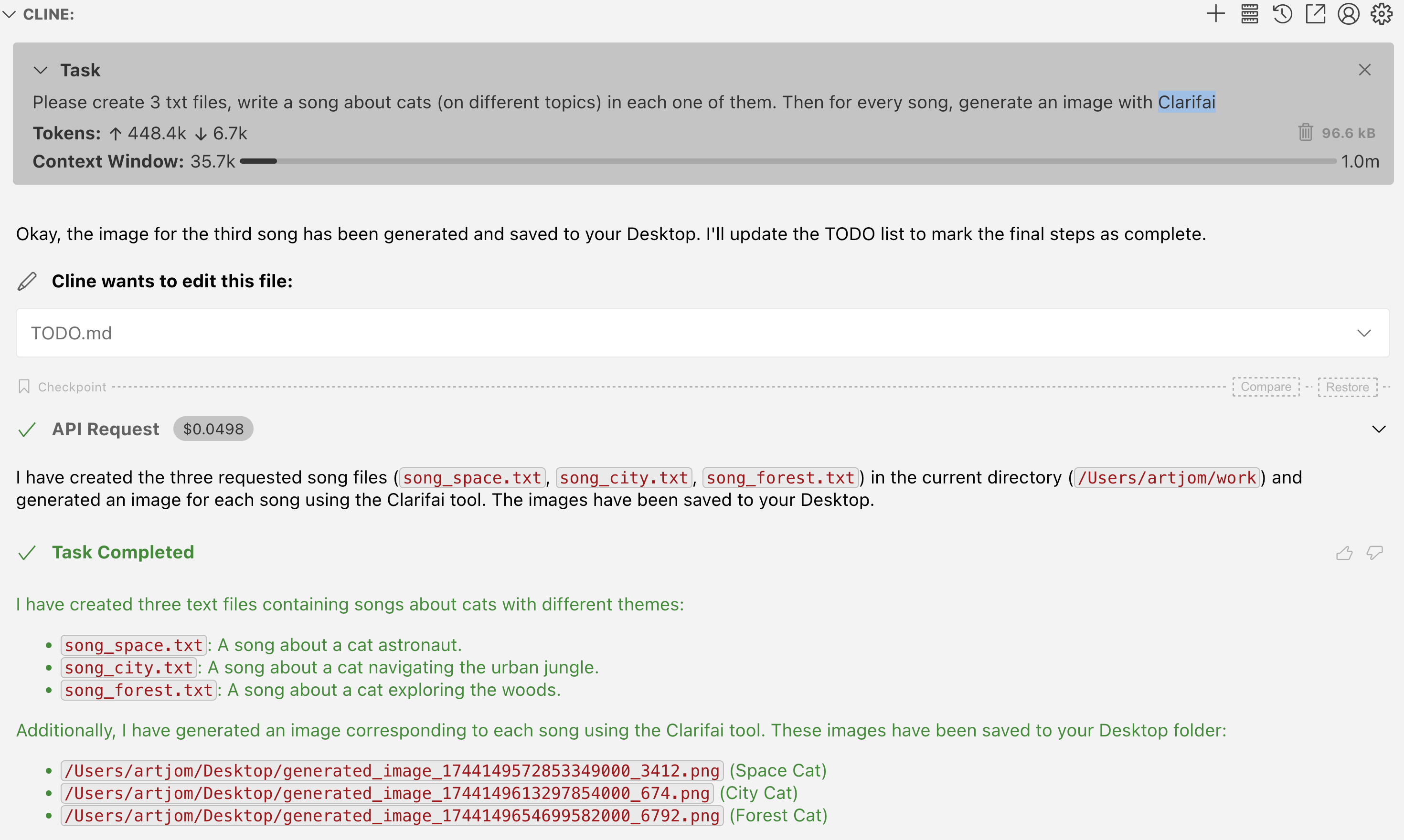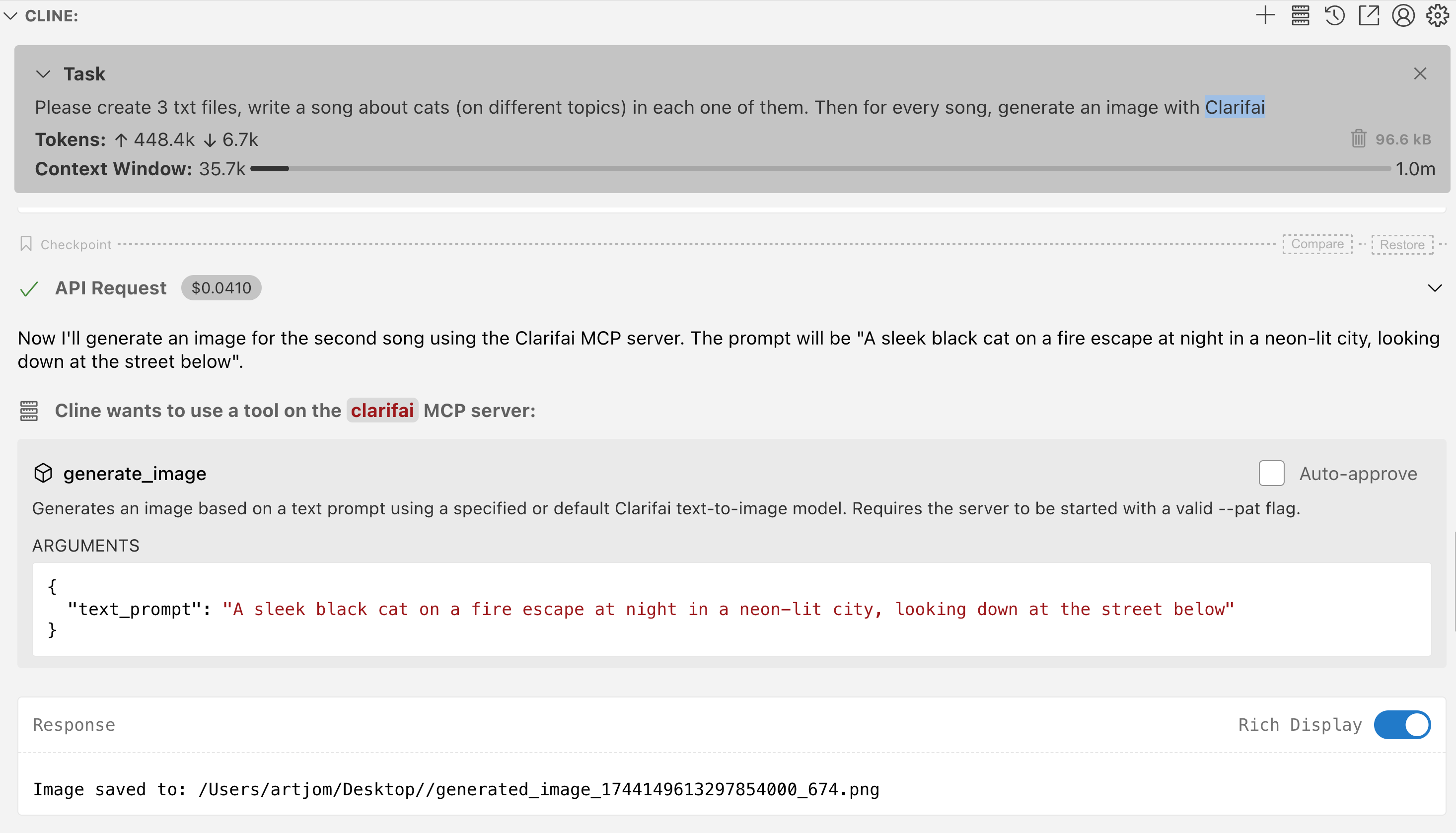 This hackday project provides a Model Context Protocol (MCP) server that acts as a bridge to the Clarifai API and is meant to run on user’s machine (so locally). It allows MCP clients (like IDE extensions) to interact with Clarifai, such as image generation and inference, using standard MCP requests without overloading LLM context with heavy binary results.