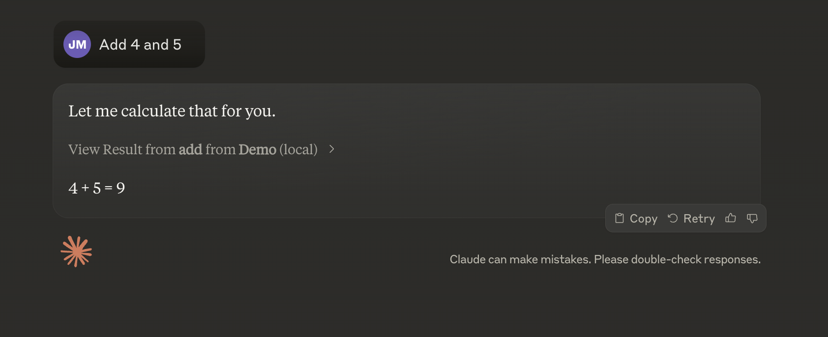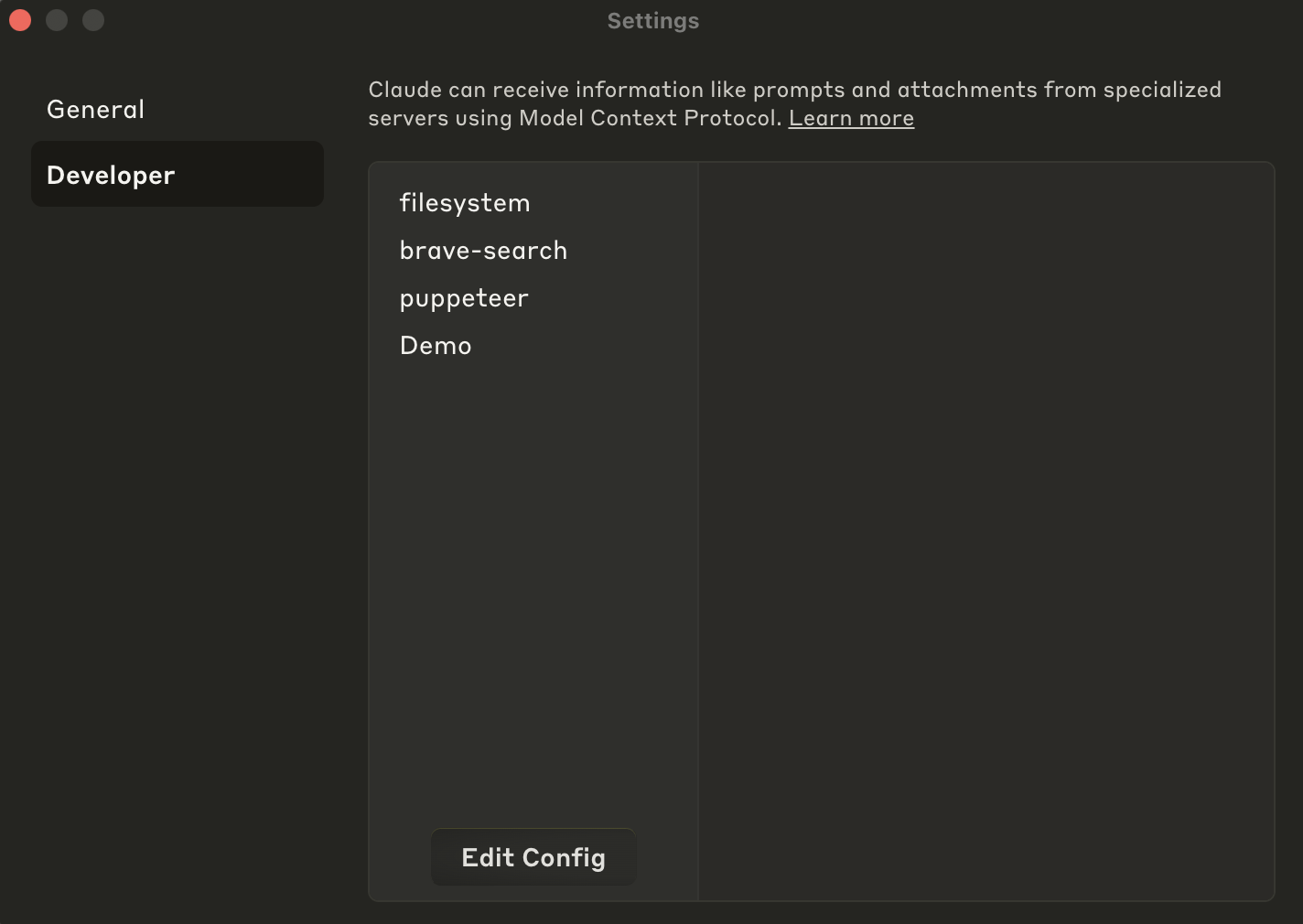 So I quit Claude and restarted it. And then saw that the “Demo” server is connected.