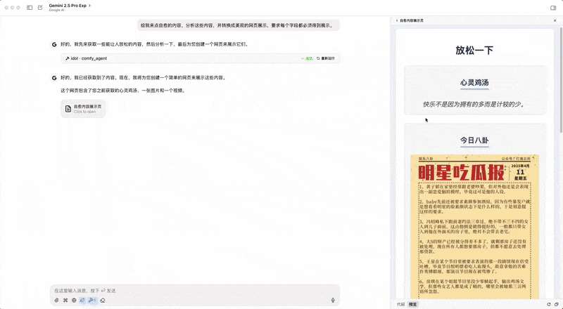 uv run --with mcp[cli] mcp run {YOUR_PATH}/comfy-mcp/server.py - 提示词:给我来点自愈的内容,分析这些内容,并转换成美观的网页展示,要求每个字段都必须得到展示。