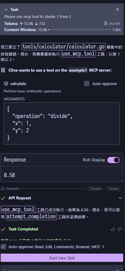 go run . -t sse 2025/04/02 09:35:05 Registered tool: calculate 2025/04/02 09:35:05 SSE server listening on localhost:8000