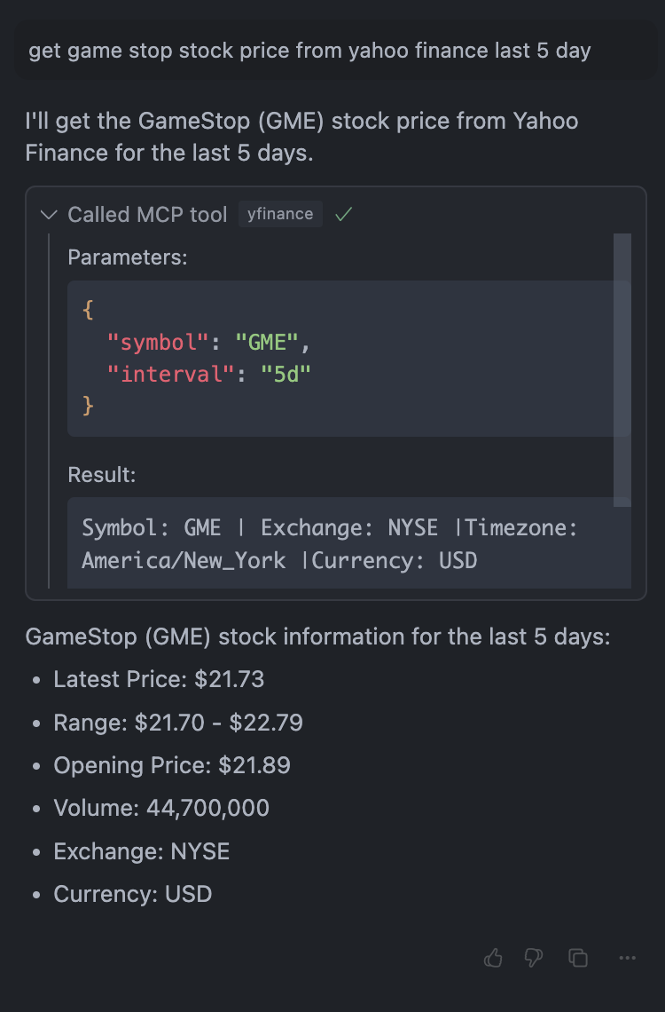 A hyper-mcp plugin retrieves stock pricing info from Yahoo Finance.
