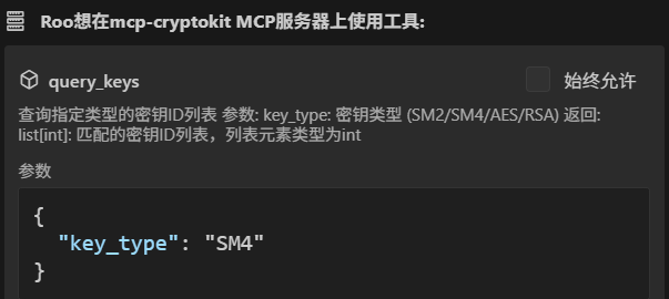 Roo Code会自动调用mcp-cryptokit服务,创建sm4密钥,并使用sm4密钥加密明文。示例如下: