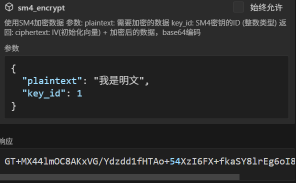 3.第三步,使用密钥ID和明文,调用sm4加密服务,并返回密文。