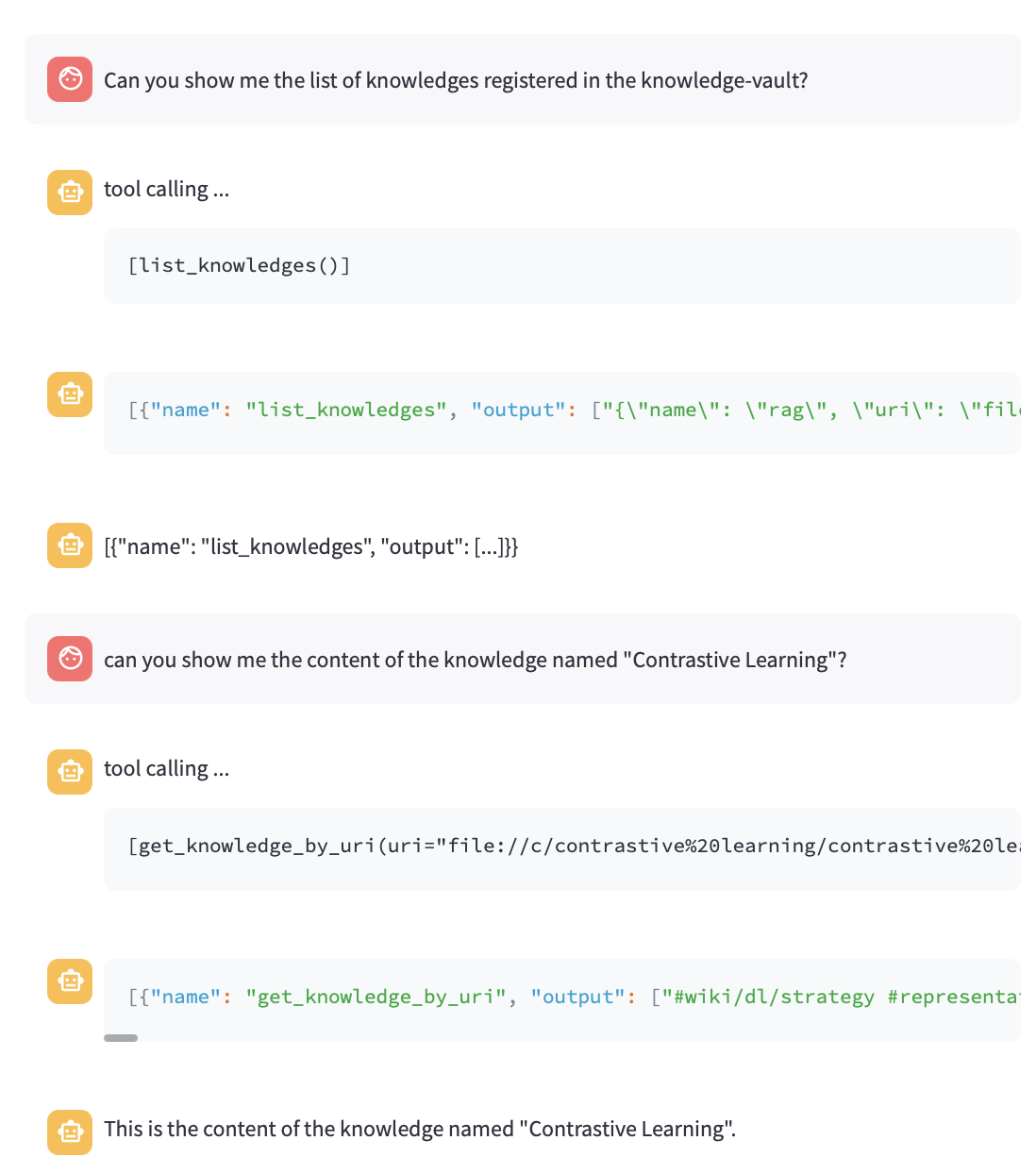 list_knowledges(): list the names and URIs of all knowledges written in the the vaultget_knowledge_by_uri(uri:str): get contents of the knowledge resource by uri