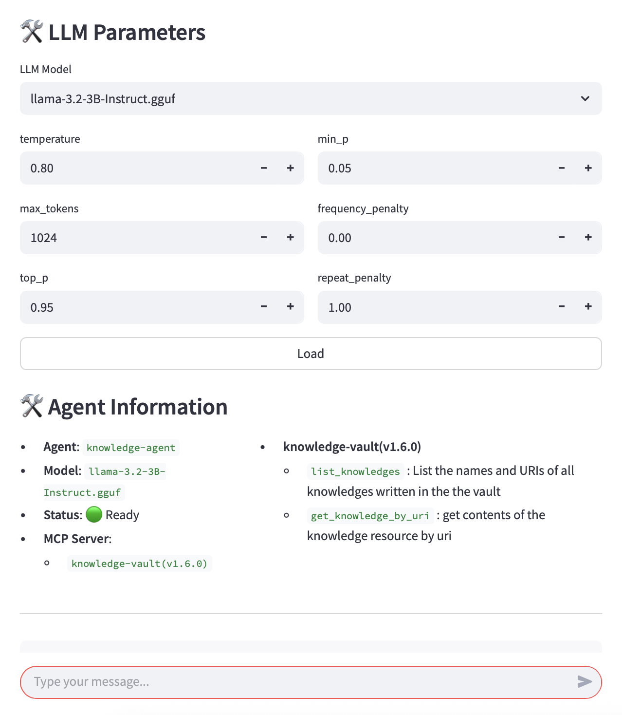 This repository also contains a simple LLM agent implementation. It currently uses the Llama 3.2 model and leverages the MCP client to retrieve relevant knowledge context.