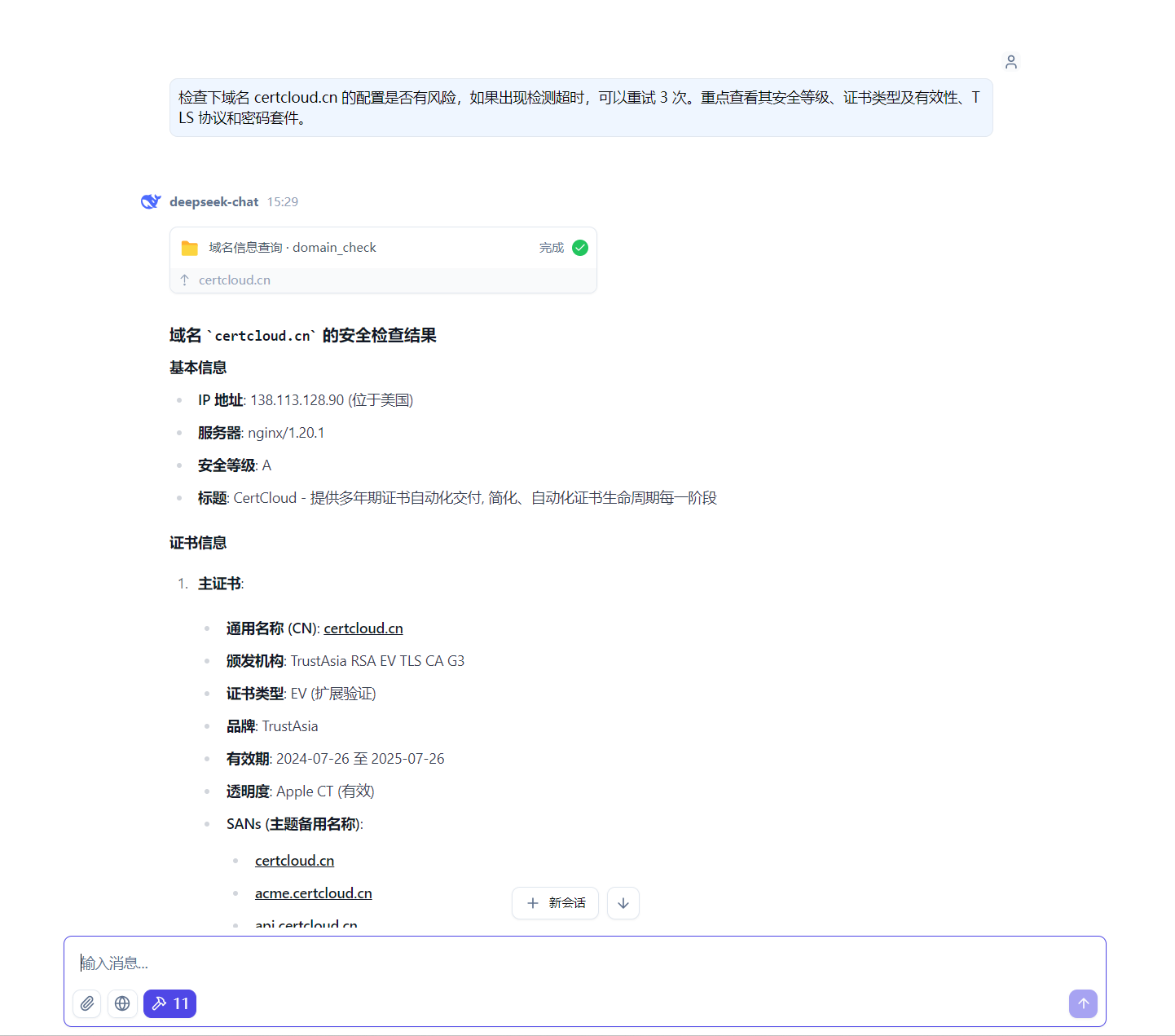 Key features include a Domain Check Tool for querying domain information, a Health Check Tool to verify the MySSL service’s operational status, and seamless integration with AI clients via the MCP protocol.