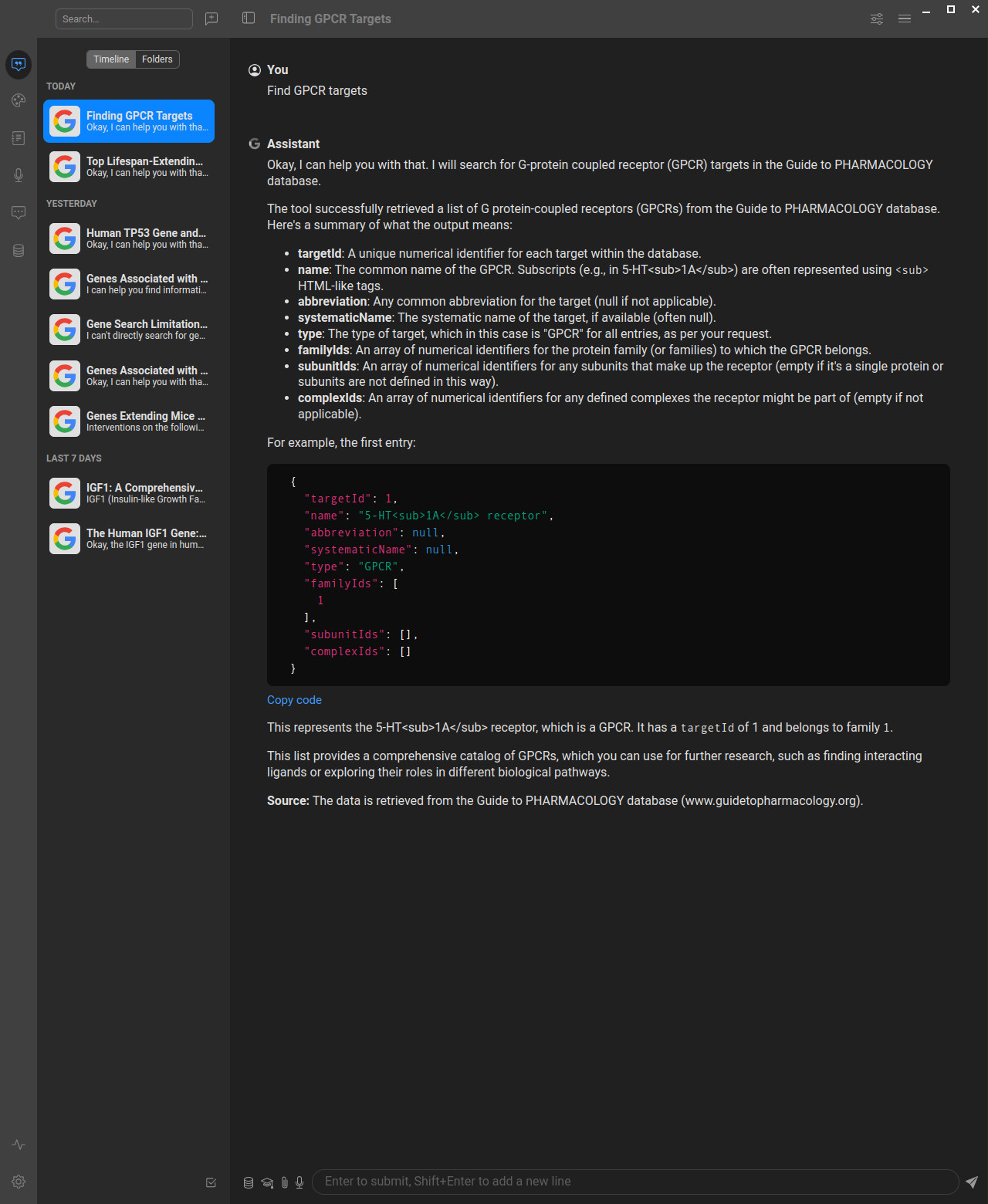 This server implements the Model Context Protocol (MCP) for the Guide to PHARMACOLOGY, providing a standardized interface for accessing pharmacological data. MCP enables AI assistants and agents to access specialized pharmacological knowledge through structured interfaces to authoritative data sources.