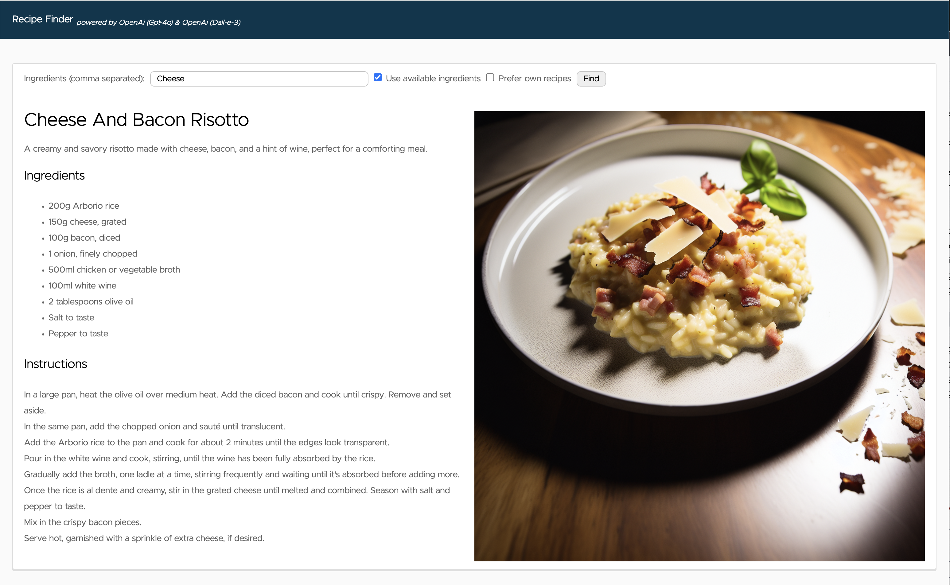 With the input “Cheese”, you should get a recipe with cheese and bacon.