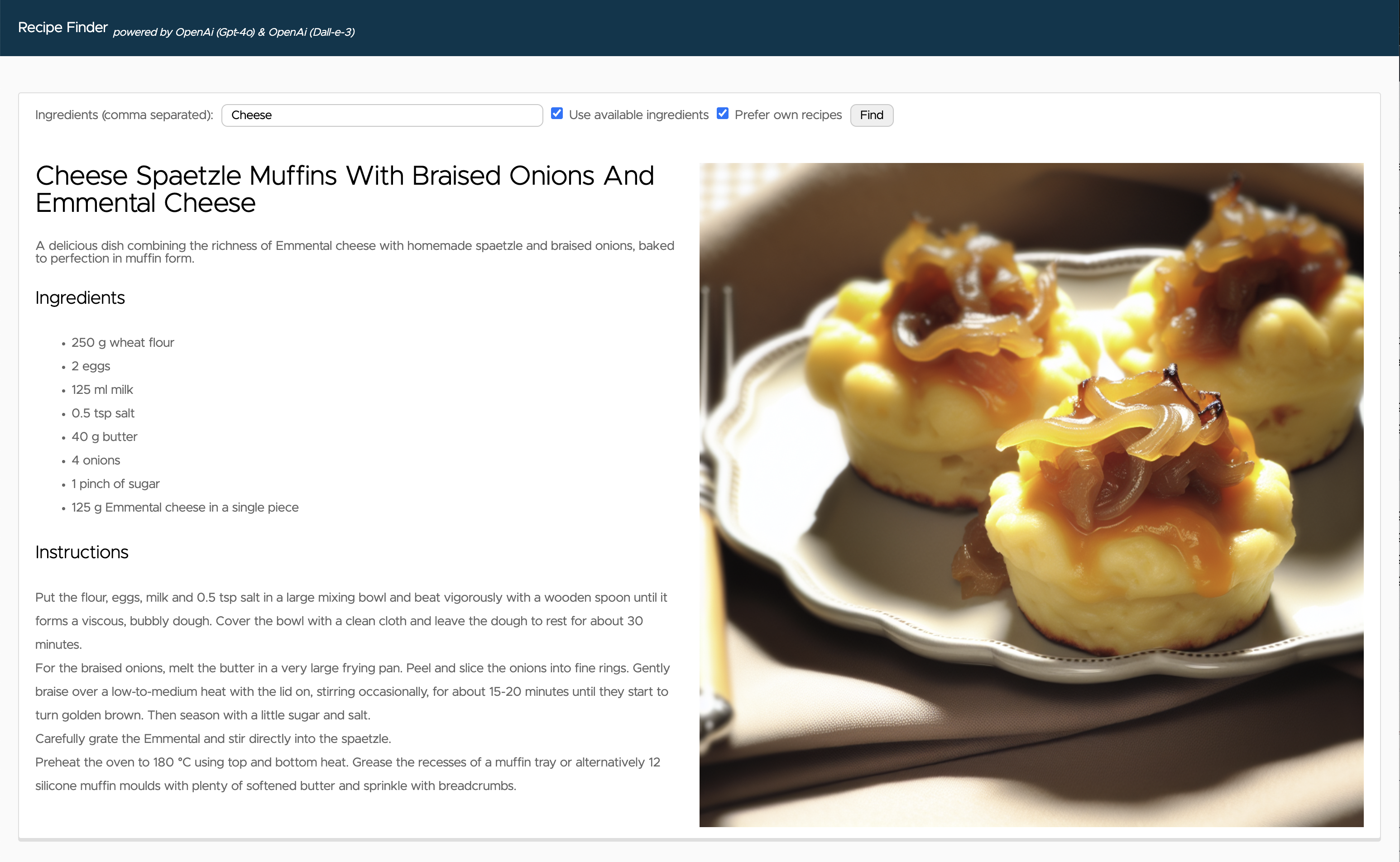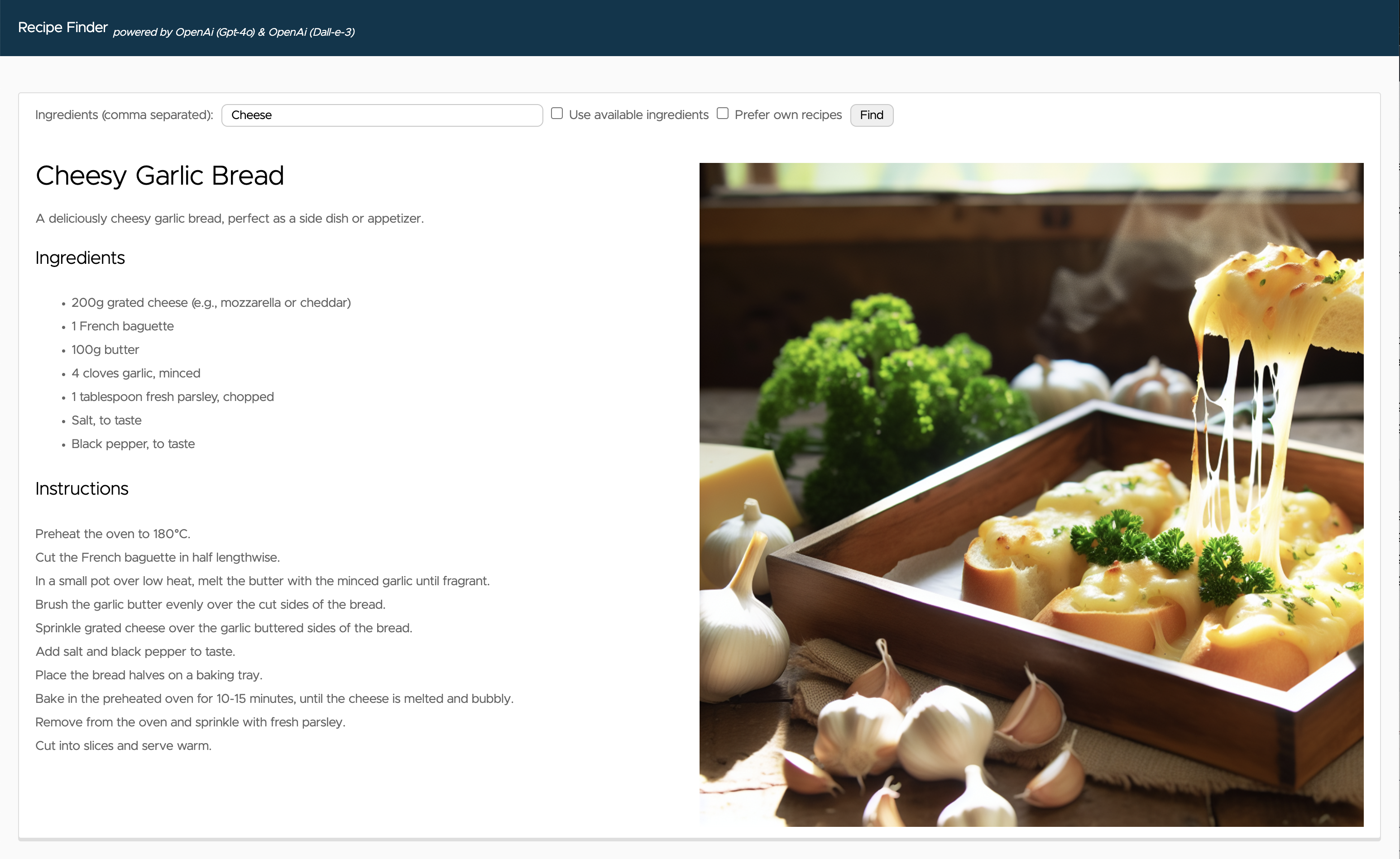 Enter the ingredients (e.g. “Cheese”) you want to find a recipe for in the form and press the “find” button.